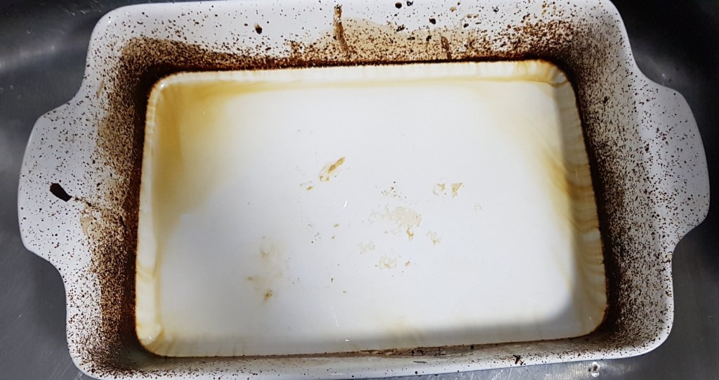 If there are still some bits left after rinsing, just scrub it off and your dish is as good as new.