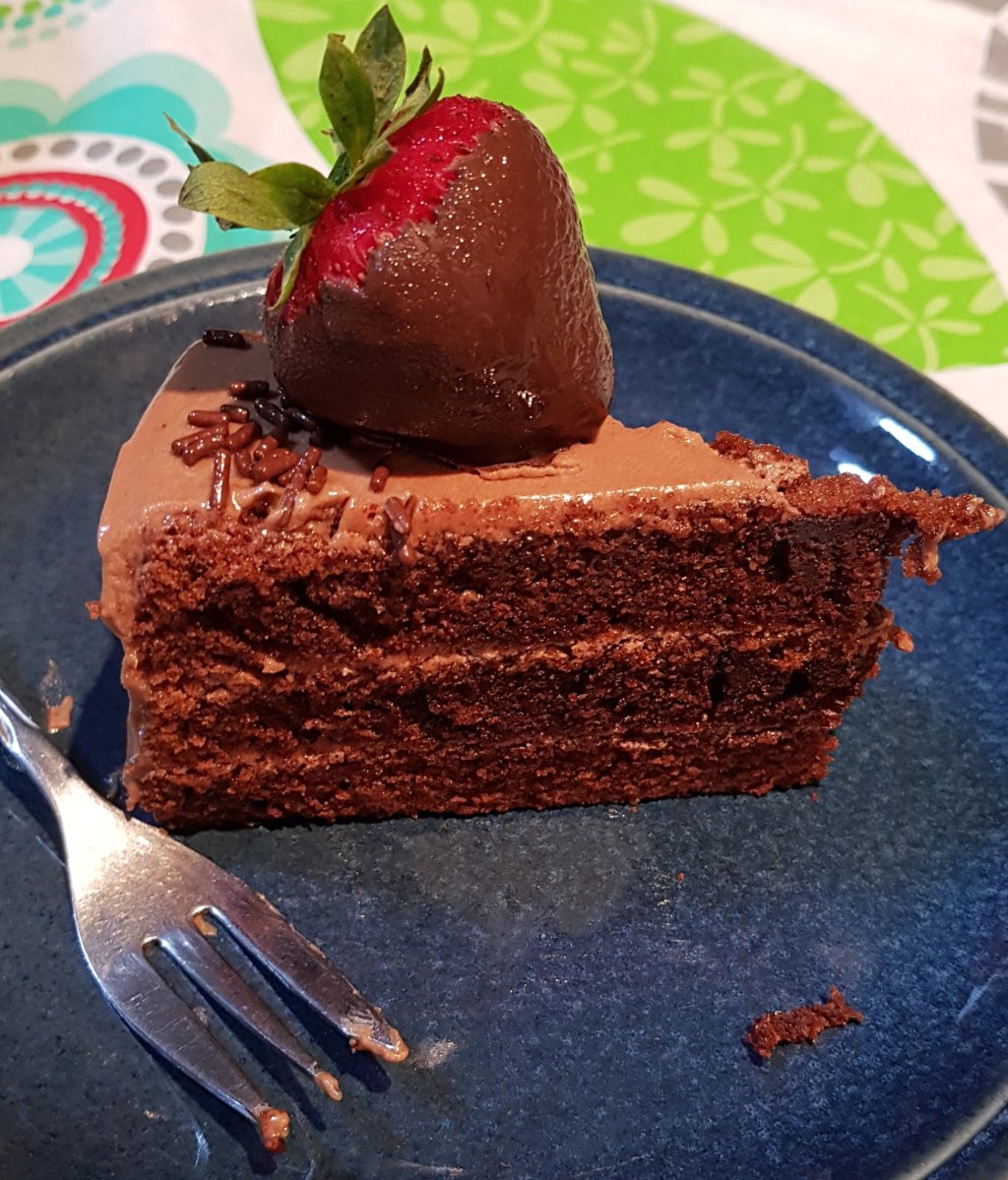 The birthday cake is finished with a small amount of frosting as well as Chocolate Covered Strawberries , which happen to be a favourite of my girl.