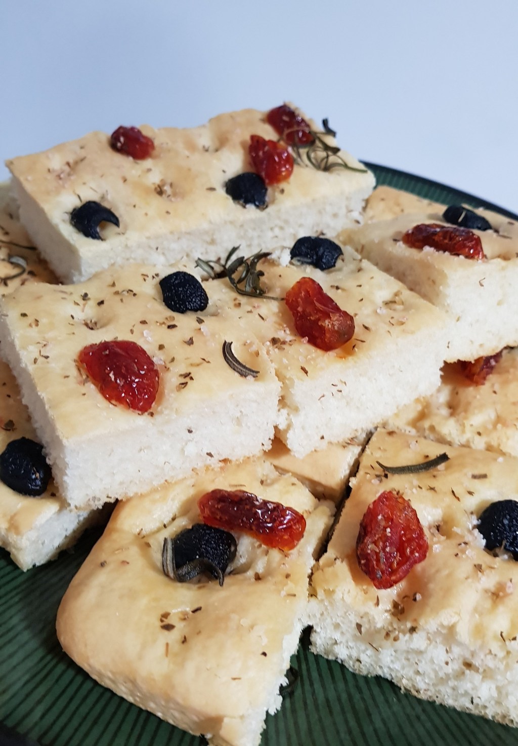 - Remove the dish towel and cling wrap for the final time. Brush the top with the garlic infused olive oil. Place the olives & cherry tomatoes into the indents you made earlier. Sprinkle the salt, rosemary & oregano over the top.
